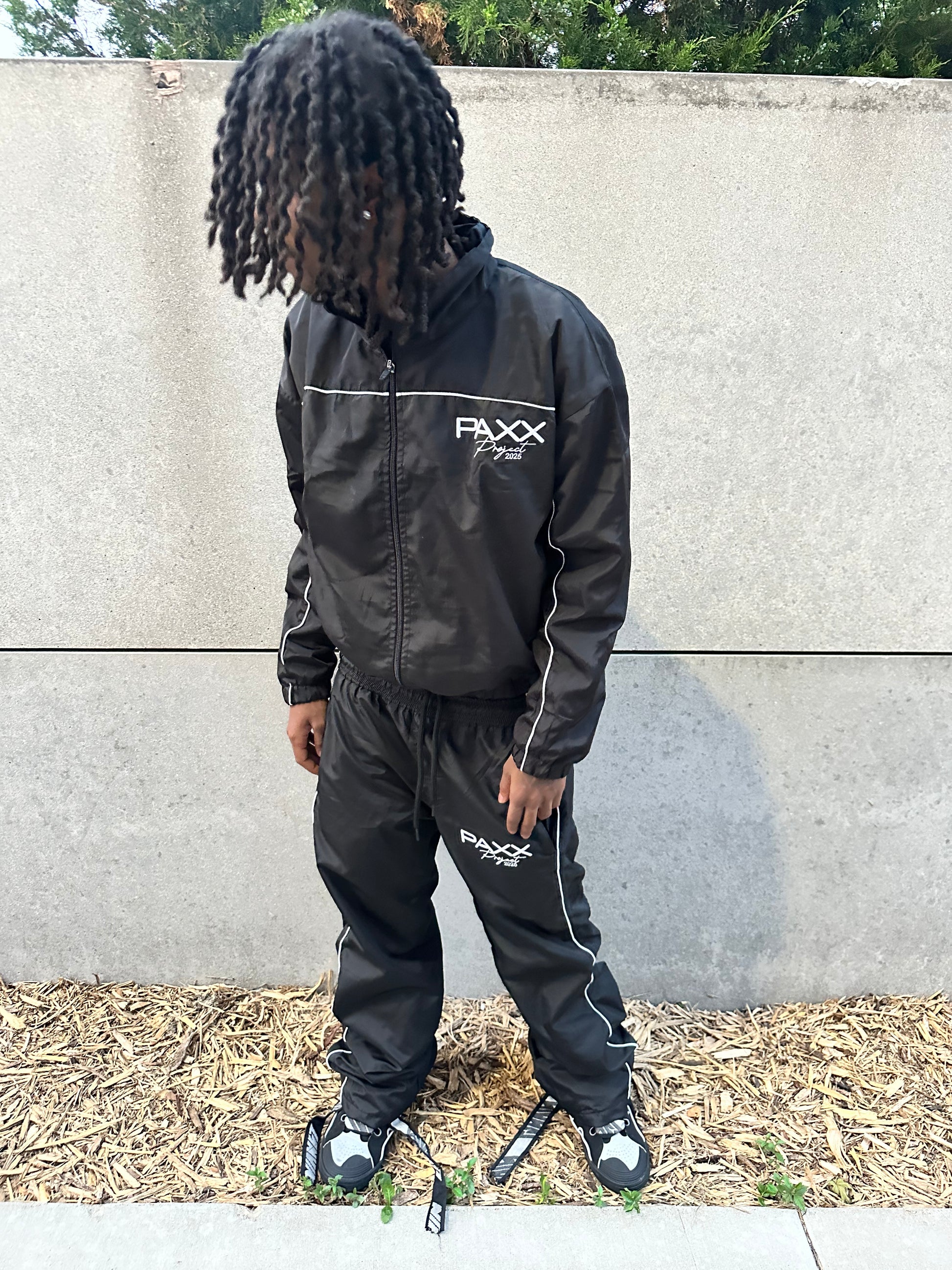 A statement from the void. The PAXX “No Signal” Tracksuit blends static silence with motion. Blacked-out nylon with a ghostly shine is trimmed with white piping, like flickers from a broken screen. Minimal yet bold, it features the signature PAXX logo stamped across the chest and thigh — a symbol of disconnect, rebellion, and control.